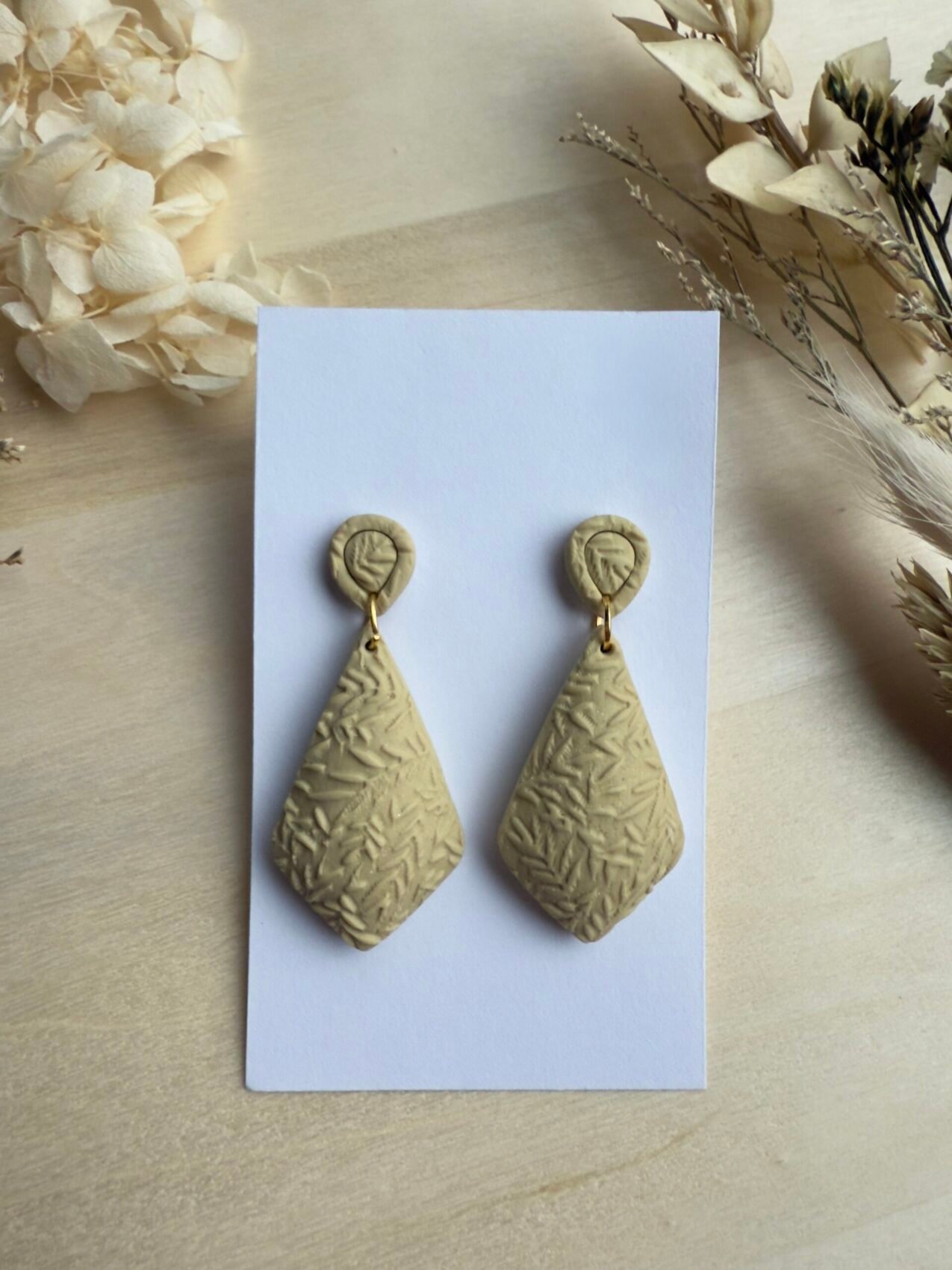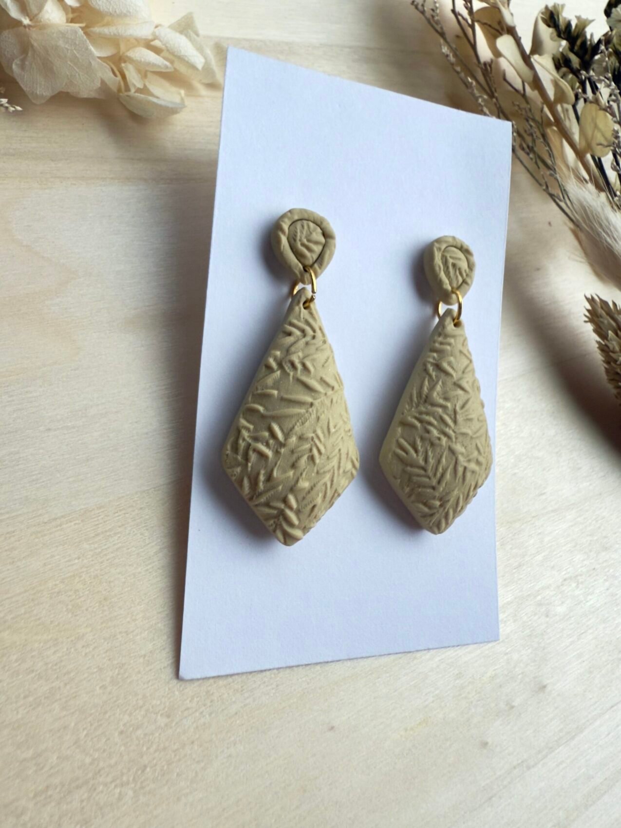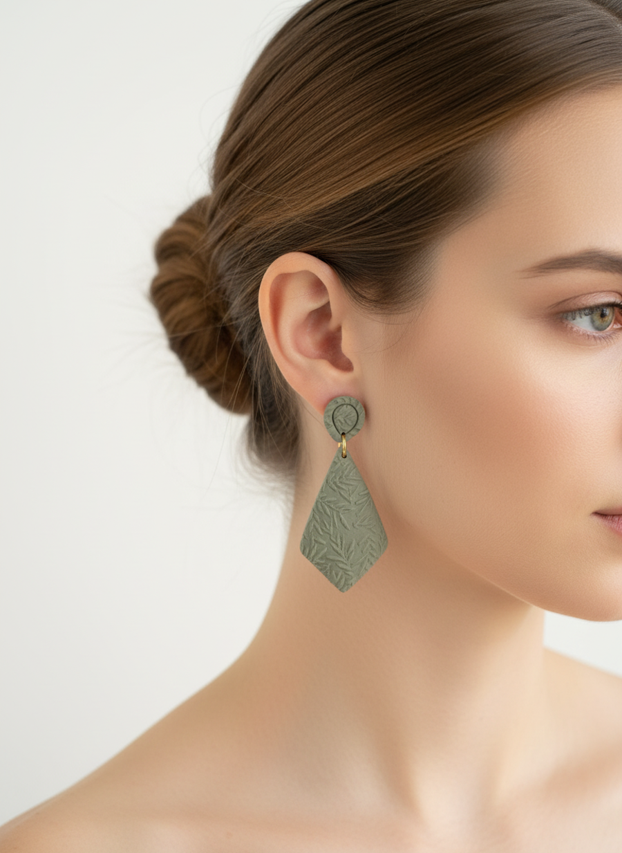 Wypukłe, ręcznie rzeźbione kolczyki o roślinnym wzorze. Każdy egzemplarz wykonano z lekkiej gliny polimerowej, dzięki czemu biżuteria jest niezwykle wygodna w noszeniu – nie obciąża ucha, a efekt 3D pięknie prezentuje się na uchu.