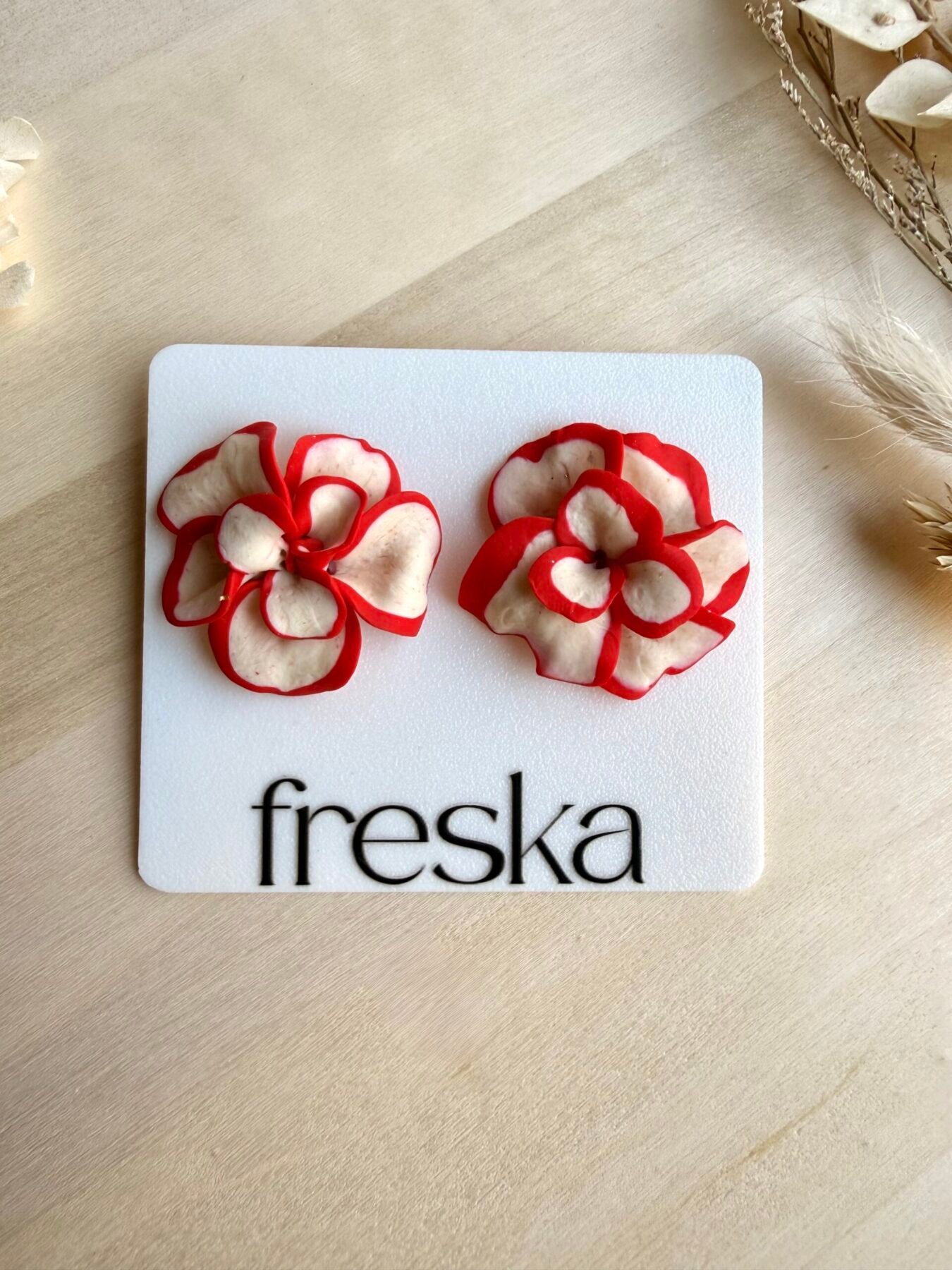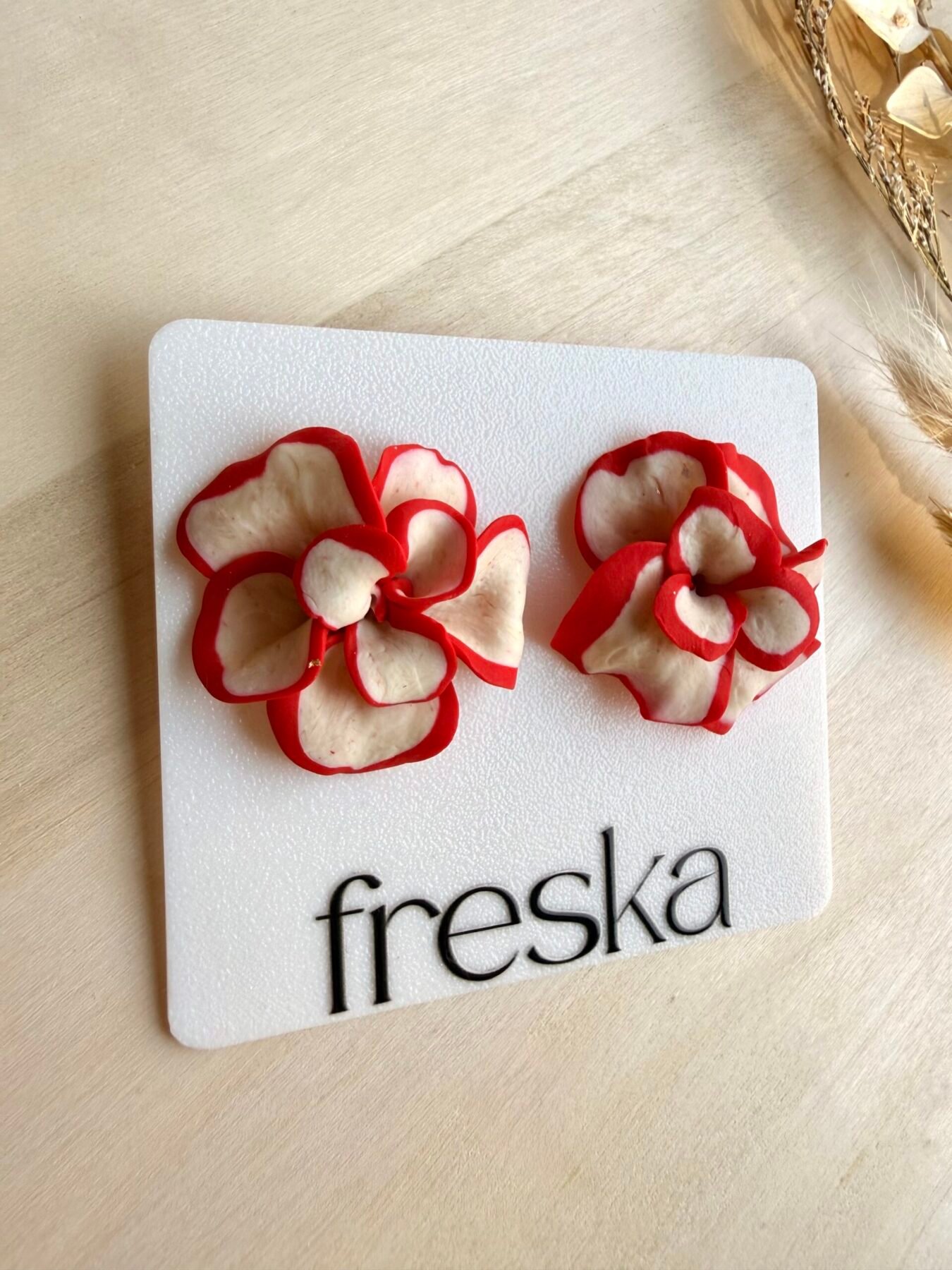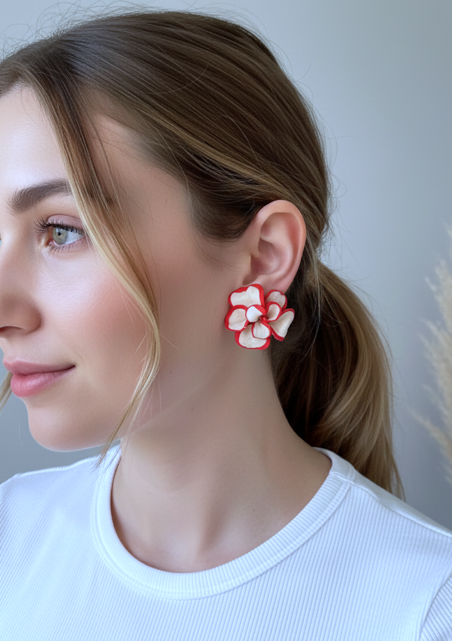 Kolczyki –kwiaty w stylu flamenco przyciągają wzrok kontrastem intensywnej czerwieni i śmietankowej bieli. Płynnie uformowane, trójwymiarowe płatki tworzą efektowną kompozycję, która pięknie otula płatek ucha i dodaje stylizacjom odważnego, kobiecego charakteru.