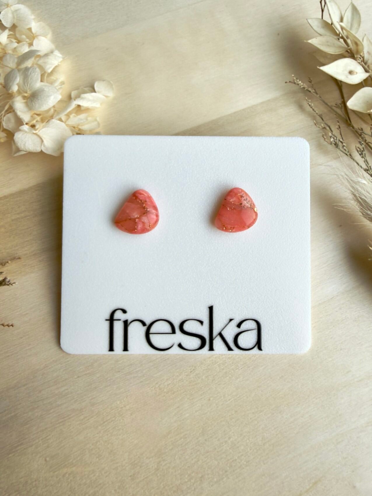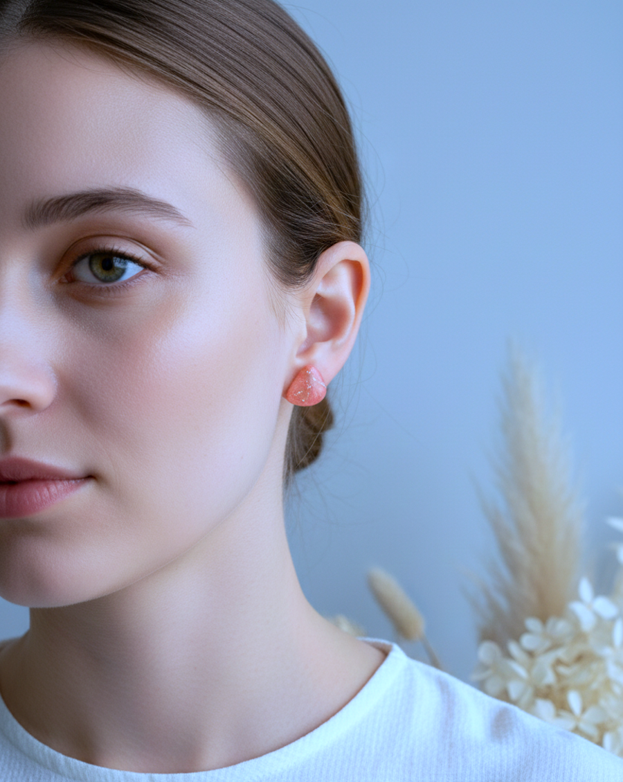 Delikatne kolczyki–kamienie w odcieniu brzoskwini to subtelny akcent kolorystyczny na co dzień. Marmurkowy wzór w różowo–brzoskwiniowej tonacji z drobnymi złotymi refleksami nadaje im lekko biżuteryjnego blasku, a ich nieregularny, „kamyczkowy” kształt pięknie układa się na płatku ucha.