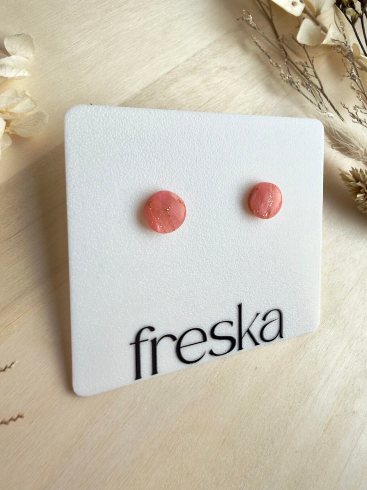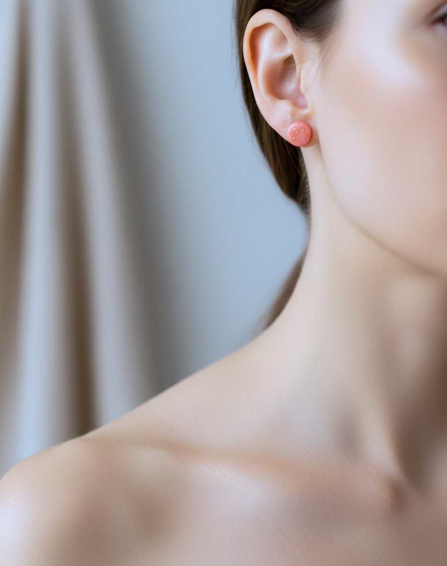 Dodaj do swojej biżuterii delikatny, romantyczny akcent z minimalistycznymi kolczykami‑kropkami w odcieniu brzoskwini. Subtelne marmurkowe przejścia i złote drobinki sprawiają, że te małe sztyfty pięknie rozświetlają okolice twarzy i pasują do stylizacji na co dzień oraz na randkę.