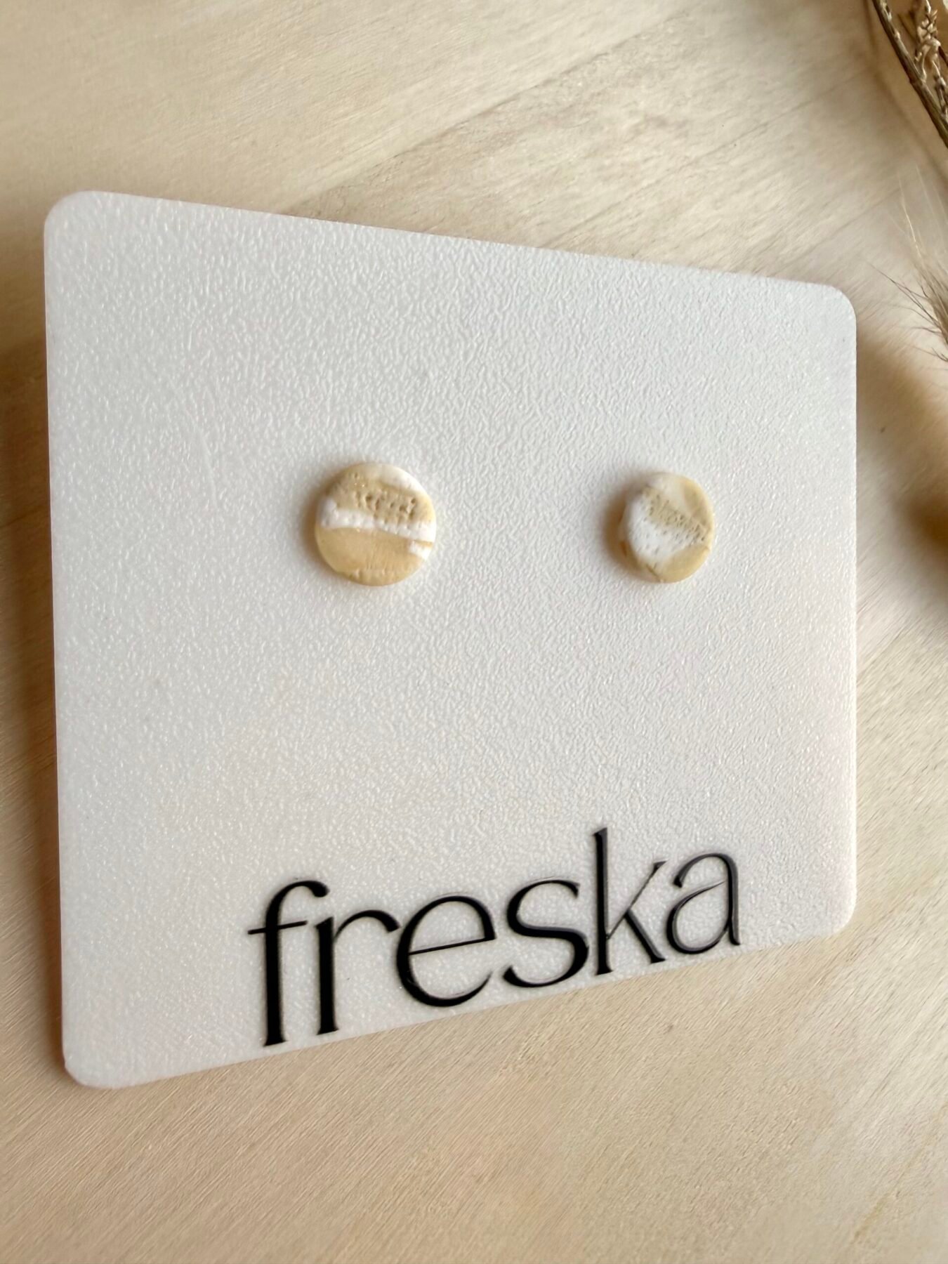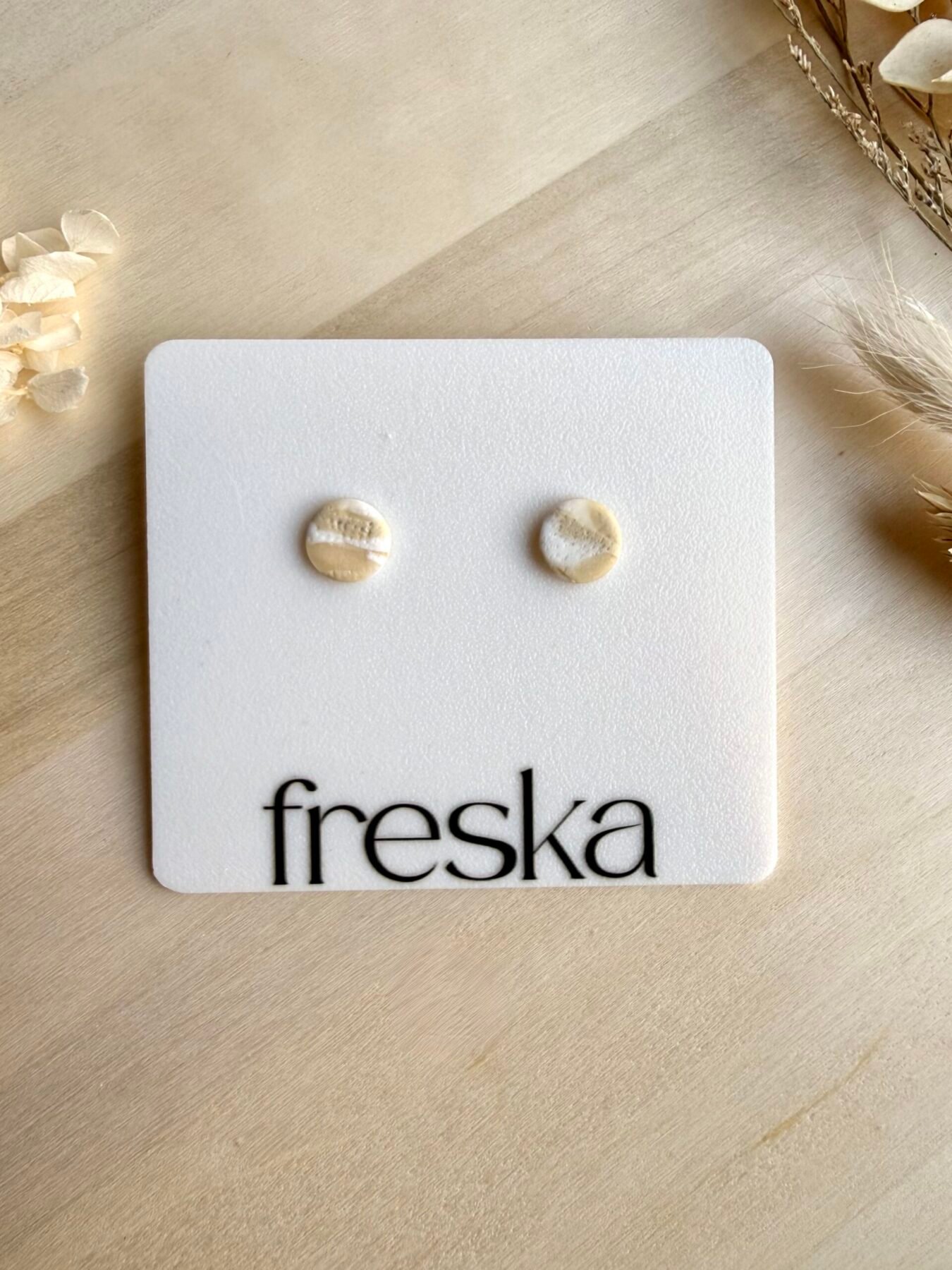 Minimalistyczne kolczyki ‑kółka w odcieniach ciepłego beżu i złamanej bieli to subtelny dodatek, który świetnie uzupełni naturalne, stonowane stylizacje. Delikatna, fakturowana linia przechodząca przez środek nadaje im lekko artystycznego charakteru, a niewielki rozmiar sprawia, że są idealne na co dzień.