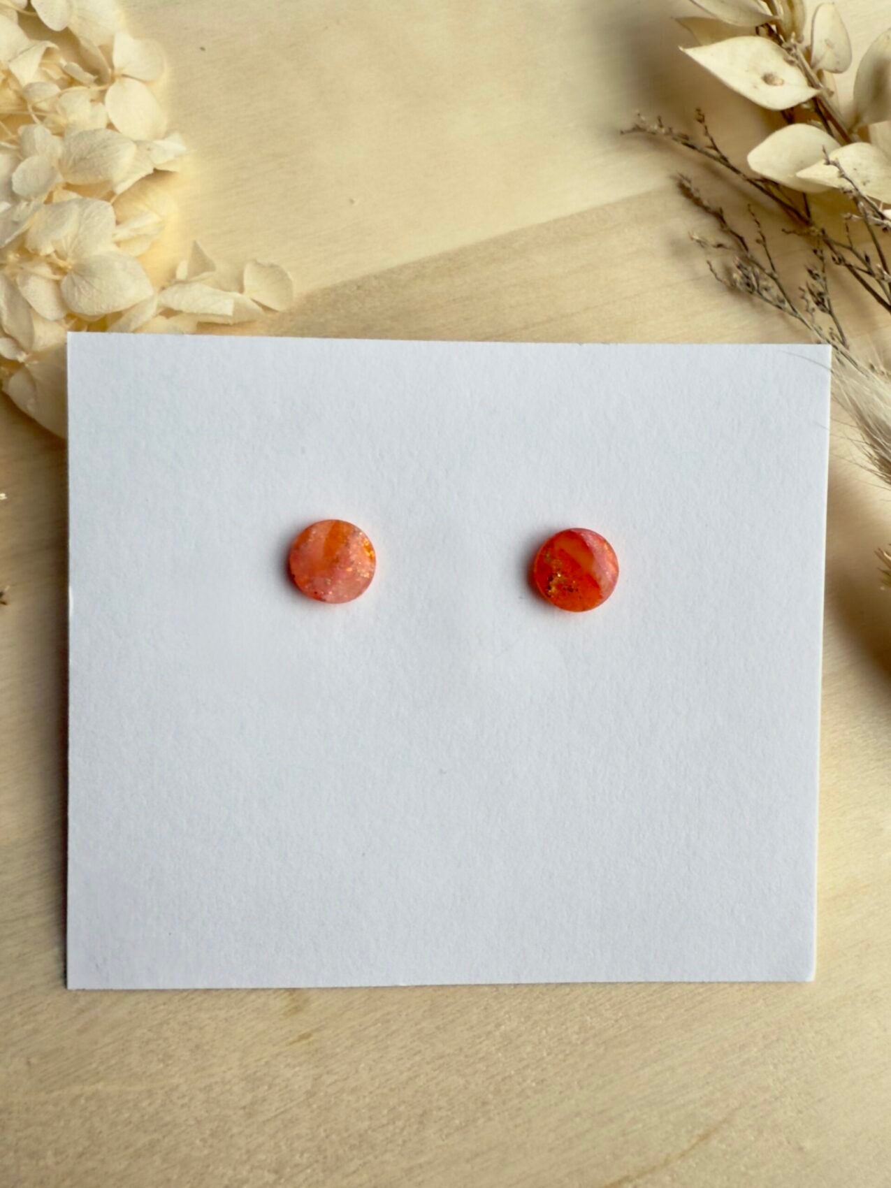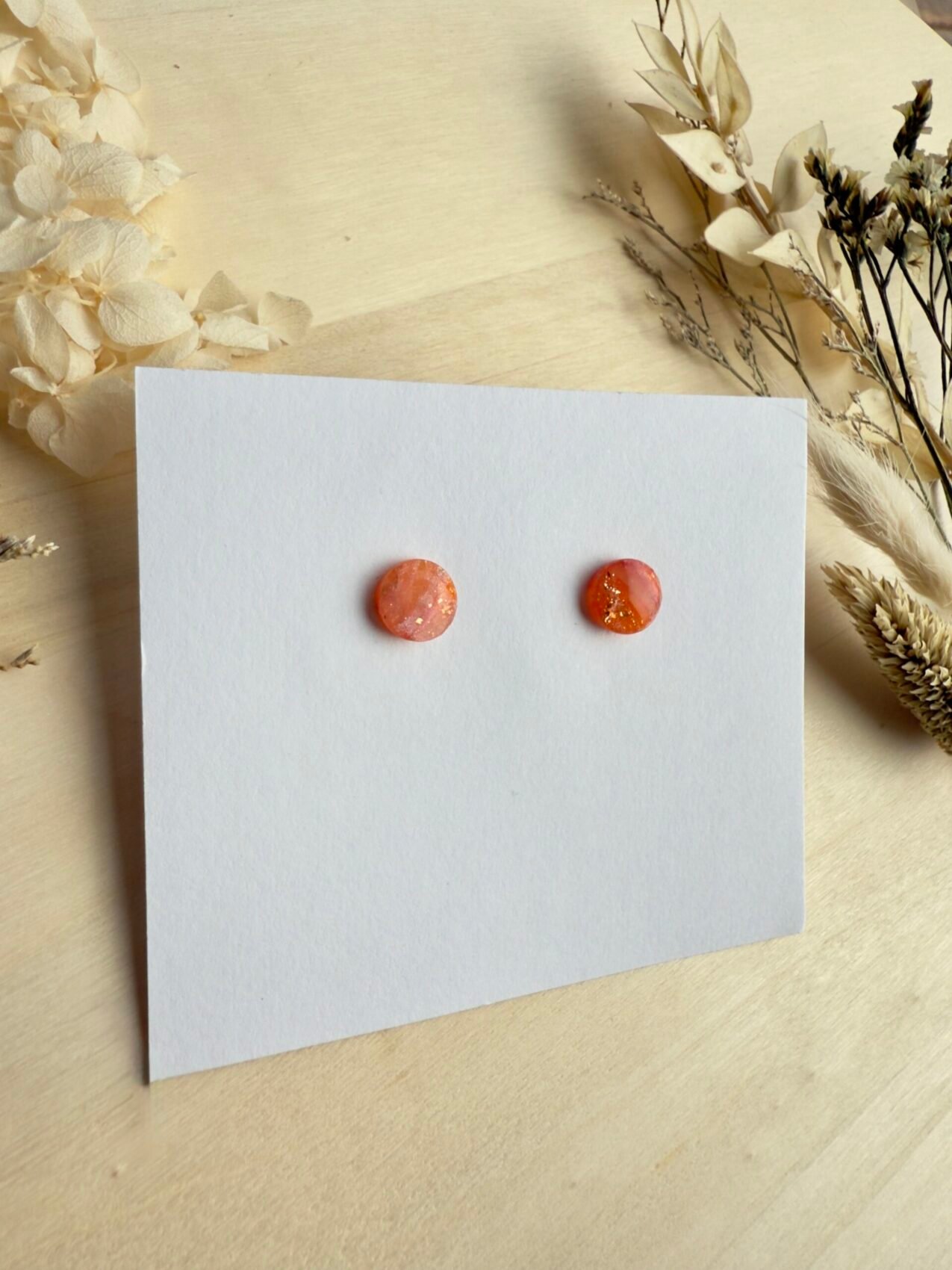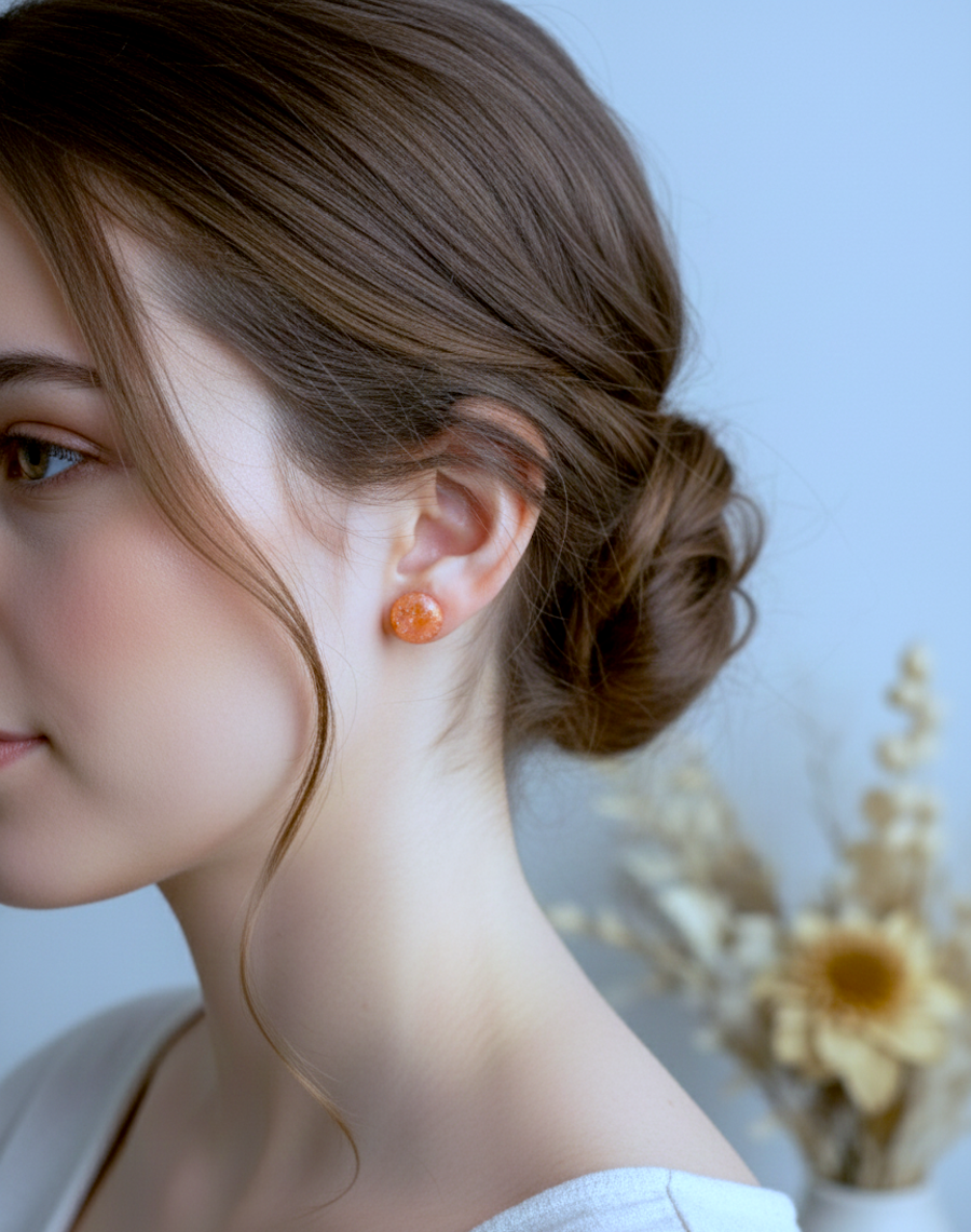 Dodaj swoim stylizacjom słonecznego blasku z minimalistycznymi kolczykami–kółkami w soczystym odcieniu pomarańczy! Ręcznie wykonane z gliny polimerowej i pokryte błyszczącą żywicą, delikatnie mienią się złotymi drobinkami, a metalowe elementy wykonano ze stali chirurgicznej – odpowiedniej również dla osób z wrażliwą skórą.