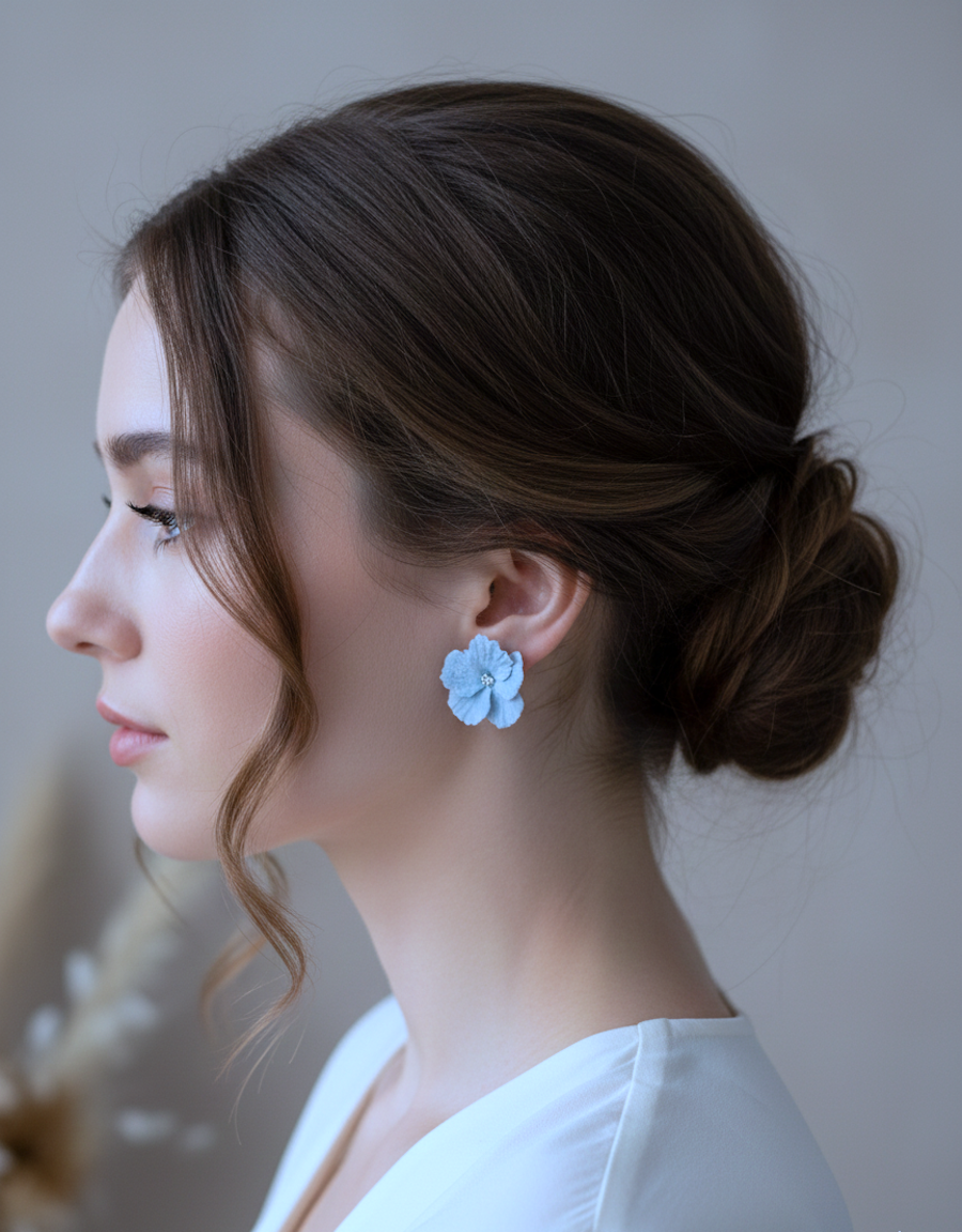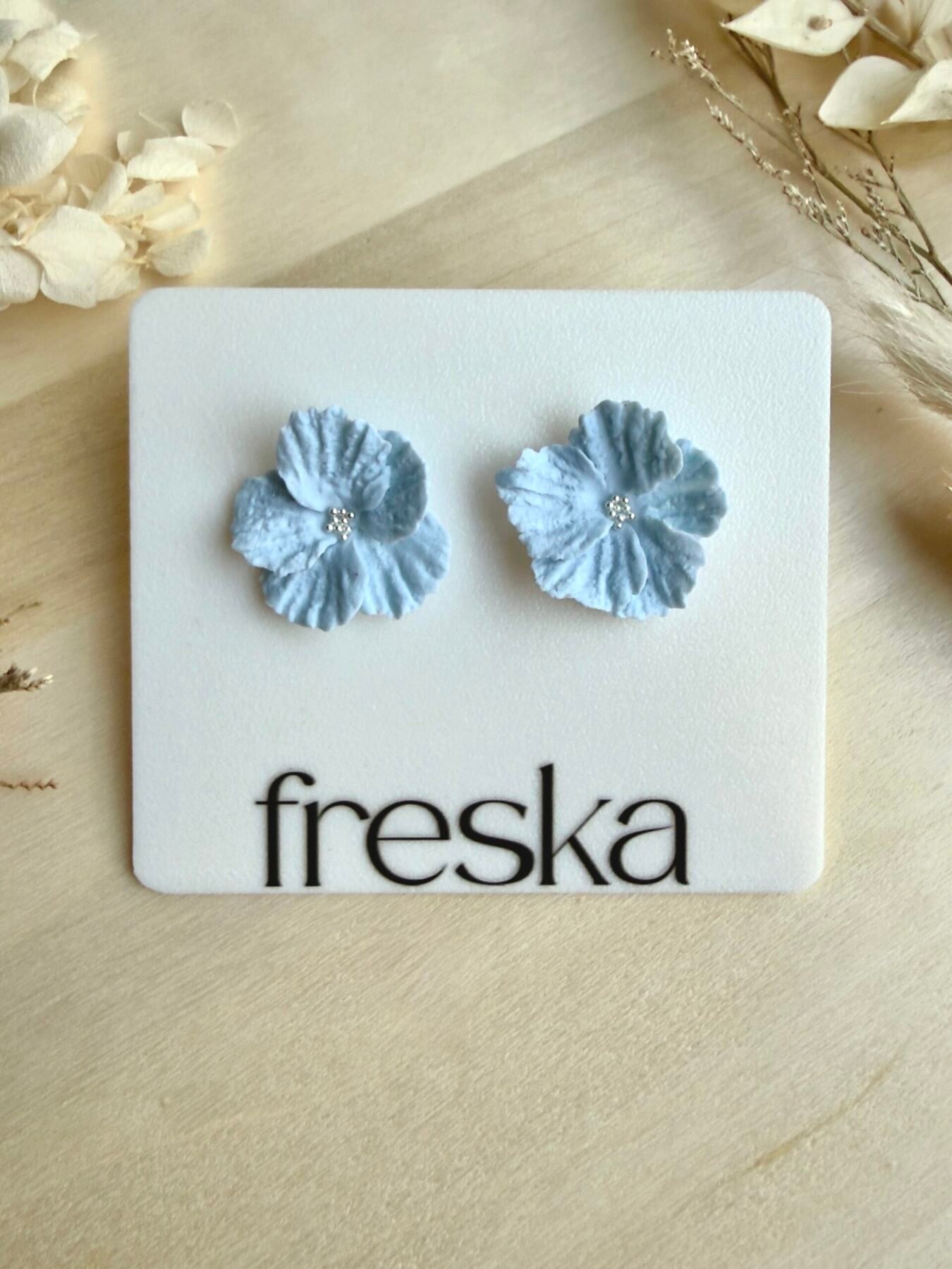 Wprowadź do swojej biżuterii nutę subtelnej elegancji z ręcznie modelowanymi kolczykami–kwiatami w pastelowym błękicie! Delikatnie pofalowane płatki zostały wykonane z gliny polimerowej, a środek zdobią drobne, srebrzyste kuleczki; elementy metalowe są ze stali chirurgicznej – odpowiednie także dla osób z wrażliwą skórą.