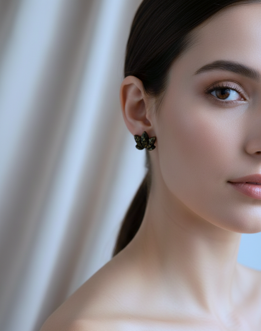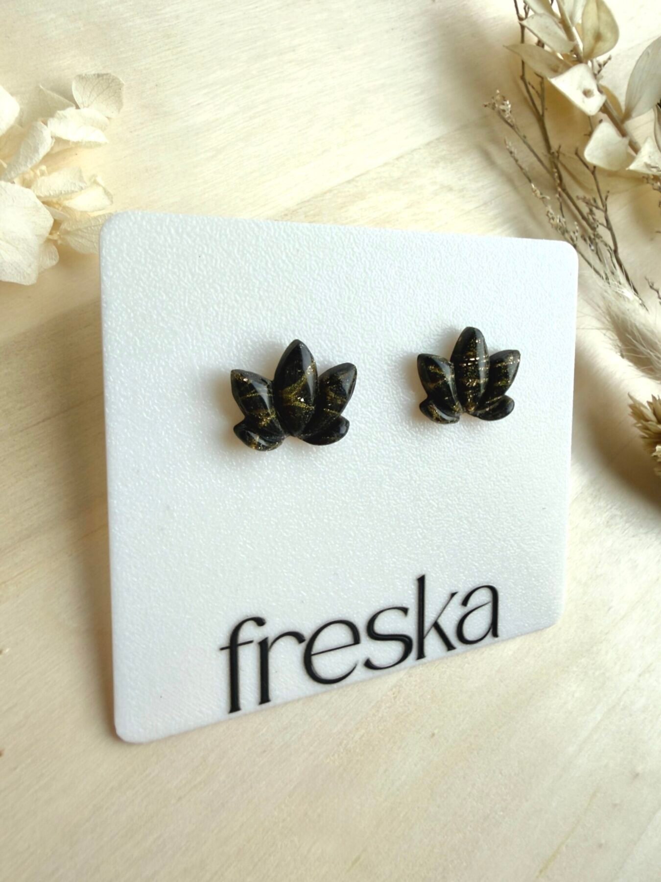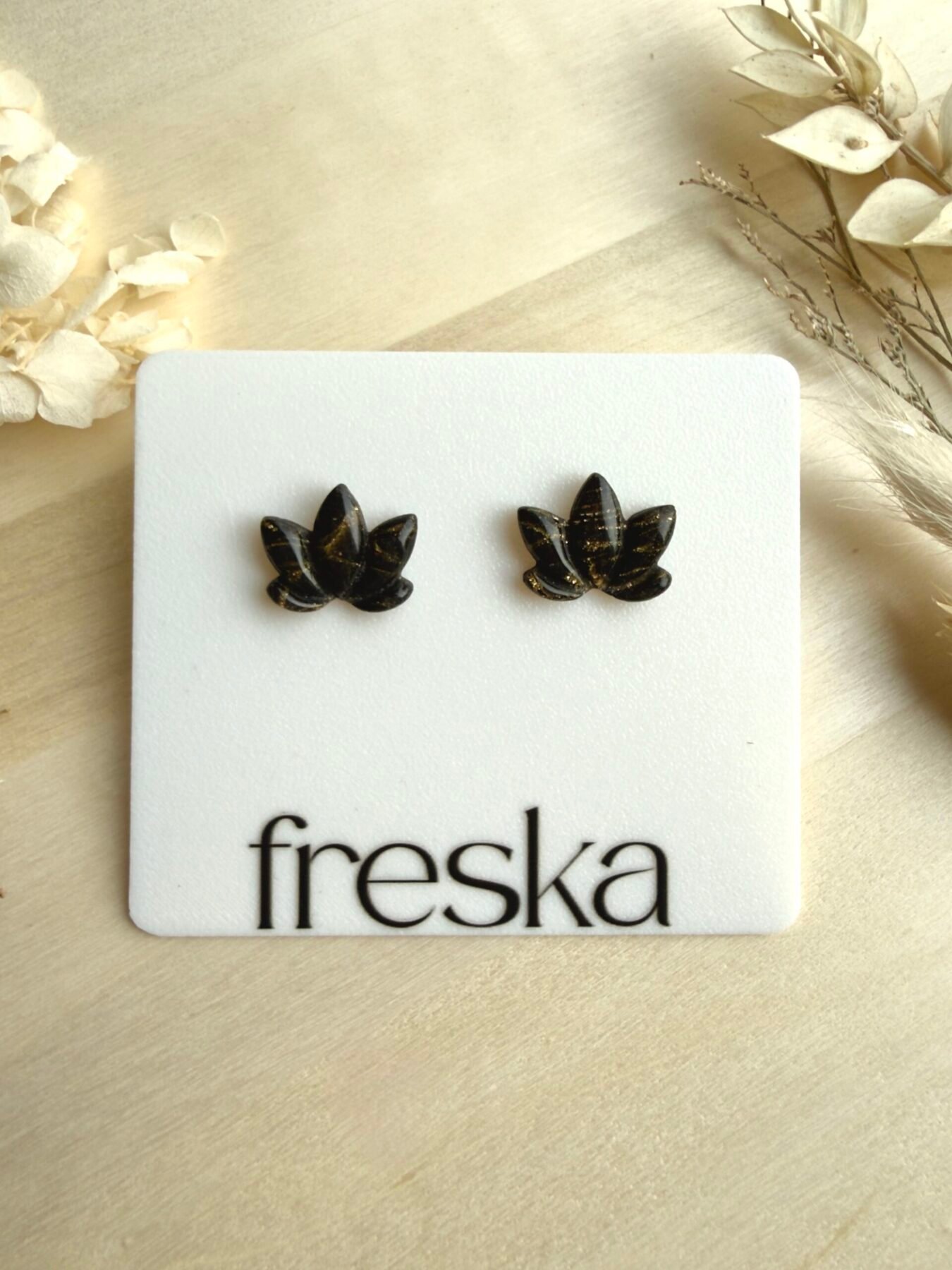 Czarne sztyfty w kształcie drobnych kwiatów lotosu z marmurkowymi, złotymi żyłkami to wyraziste, ale nadal lekkie kolczyki idealne do codziennych i wieczorowych stylizacji. Organiczny kształt liścia pięknie układa się przy uchu i dodaje stylizacji odrobiny artystycznego charakteru.