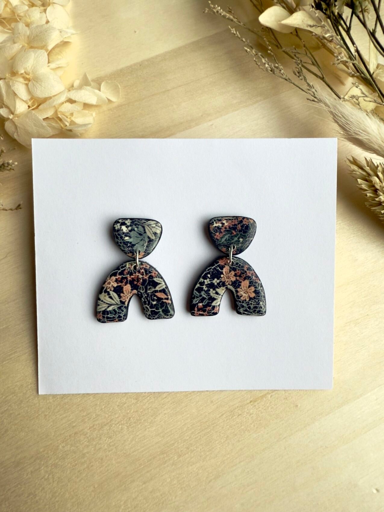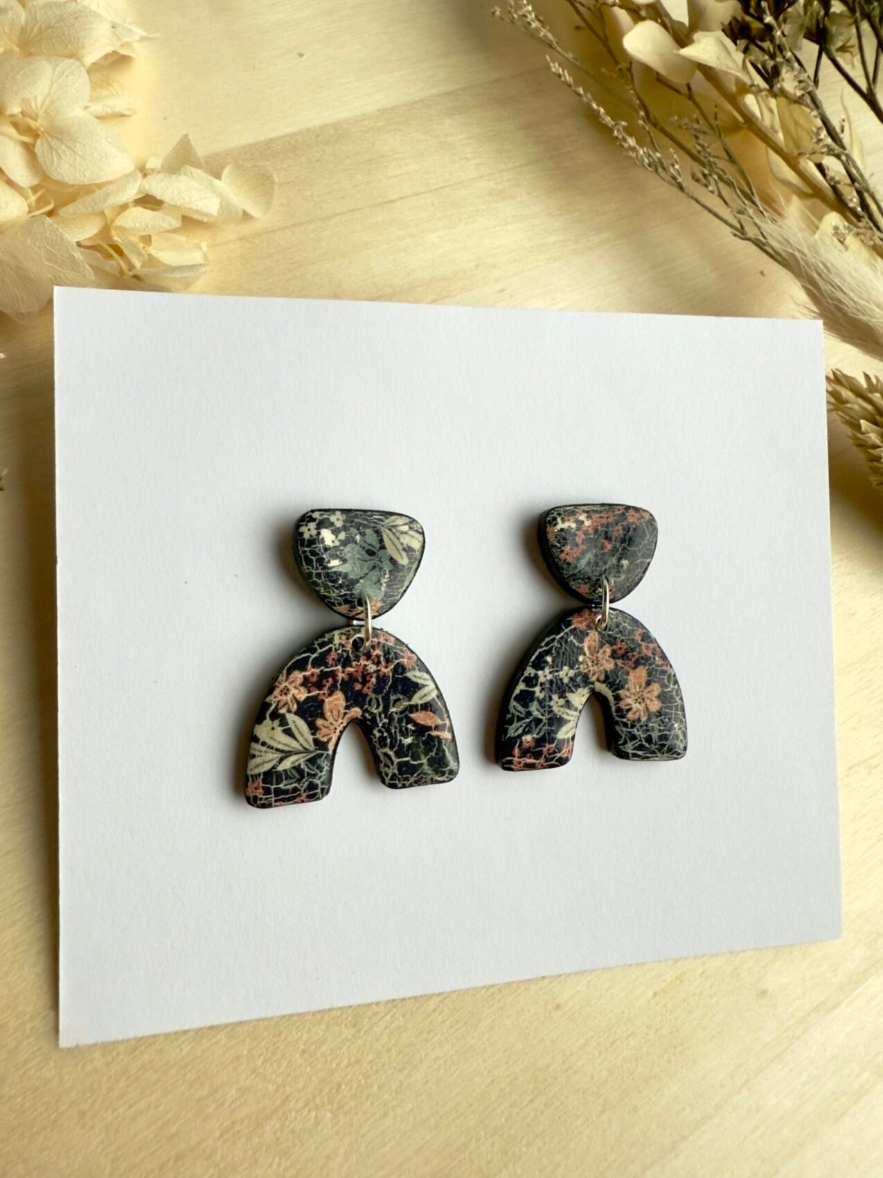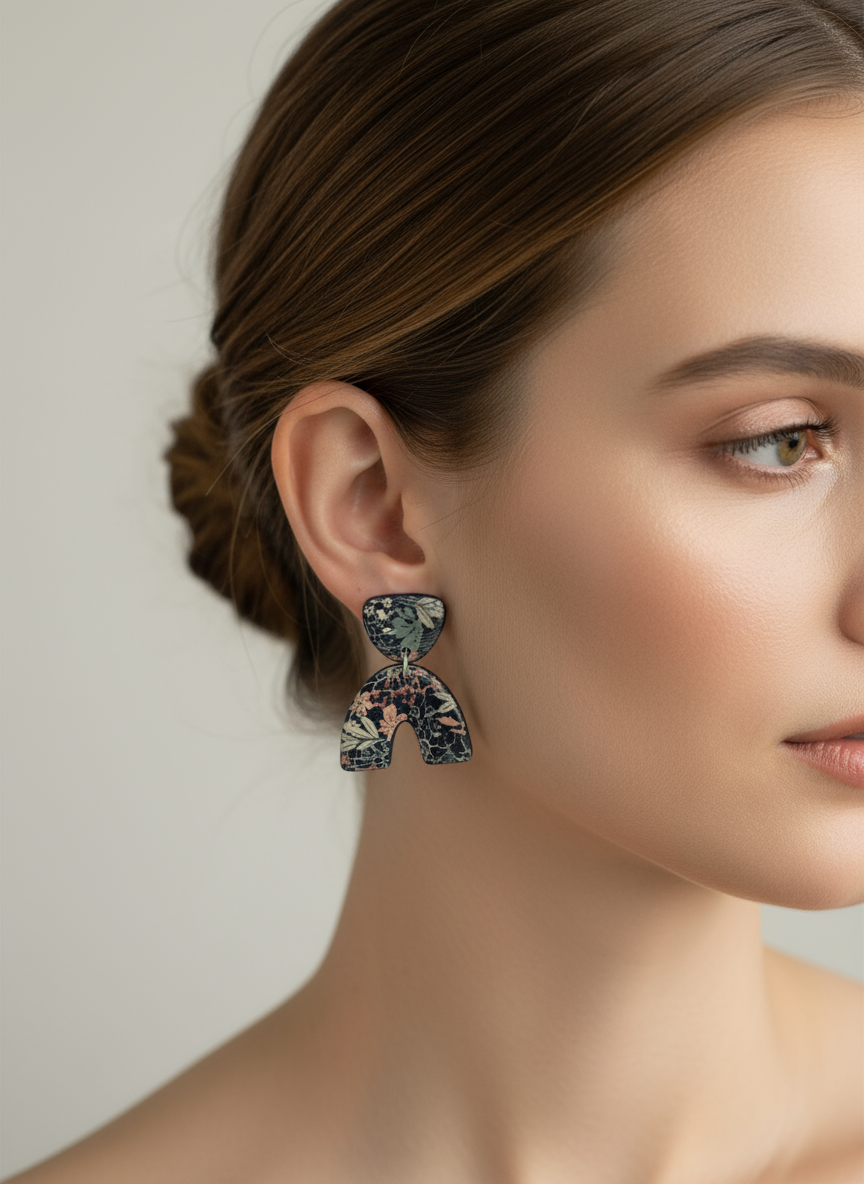 Oryginalne kolczyki z artystycznym nadrukiem roślinnym, wykonane z masy polimerowej i wykończone wygodnymi sztyftami ze stali chirurgicznej, która jest bezpieczna nawet dla bardzo wrażliwych uszu.