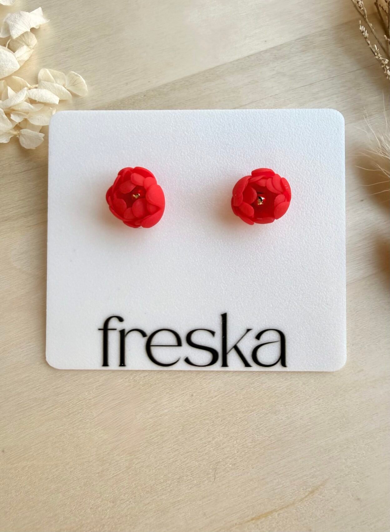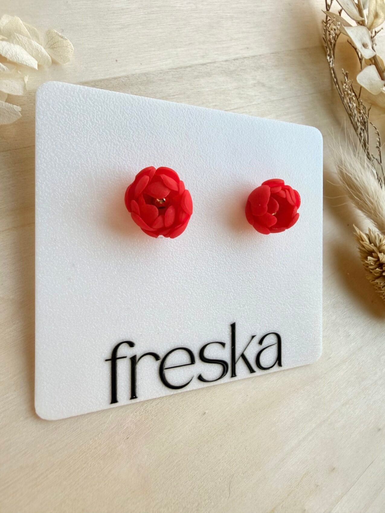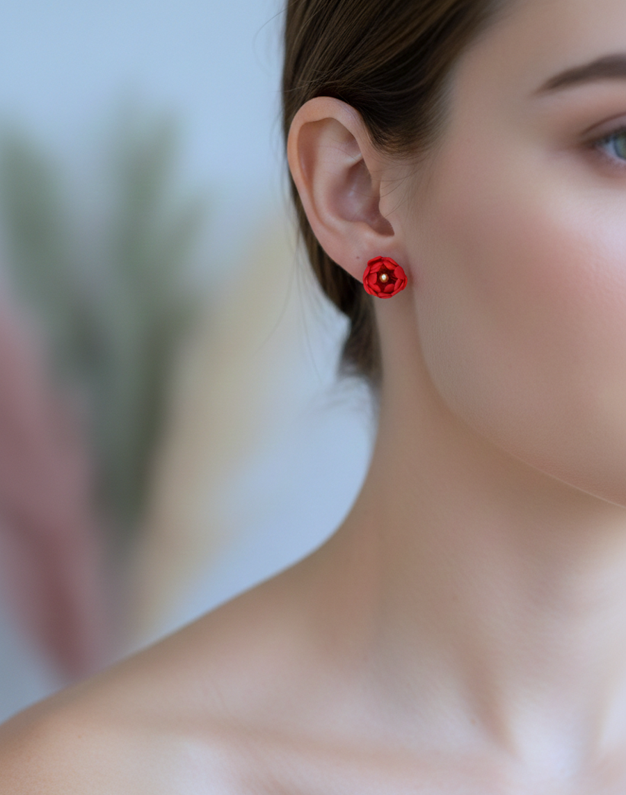 Każdy kwiat modelowany jest ręcznie, dlatego poszczególne pary mogą minimalnie różnić się między sobą, co podkreśla ich unikatowy, artystyczny charakter. Zapięcia wykonane są ze stali chirurgicznej, uznawanej za materiał hipoalergiczny i odpowiedni dla wrażliwych uszu.