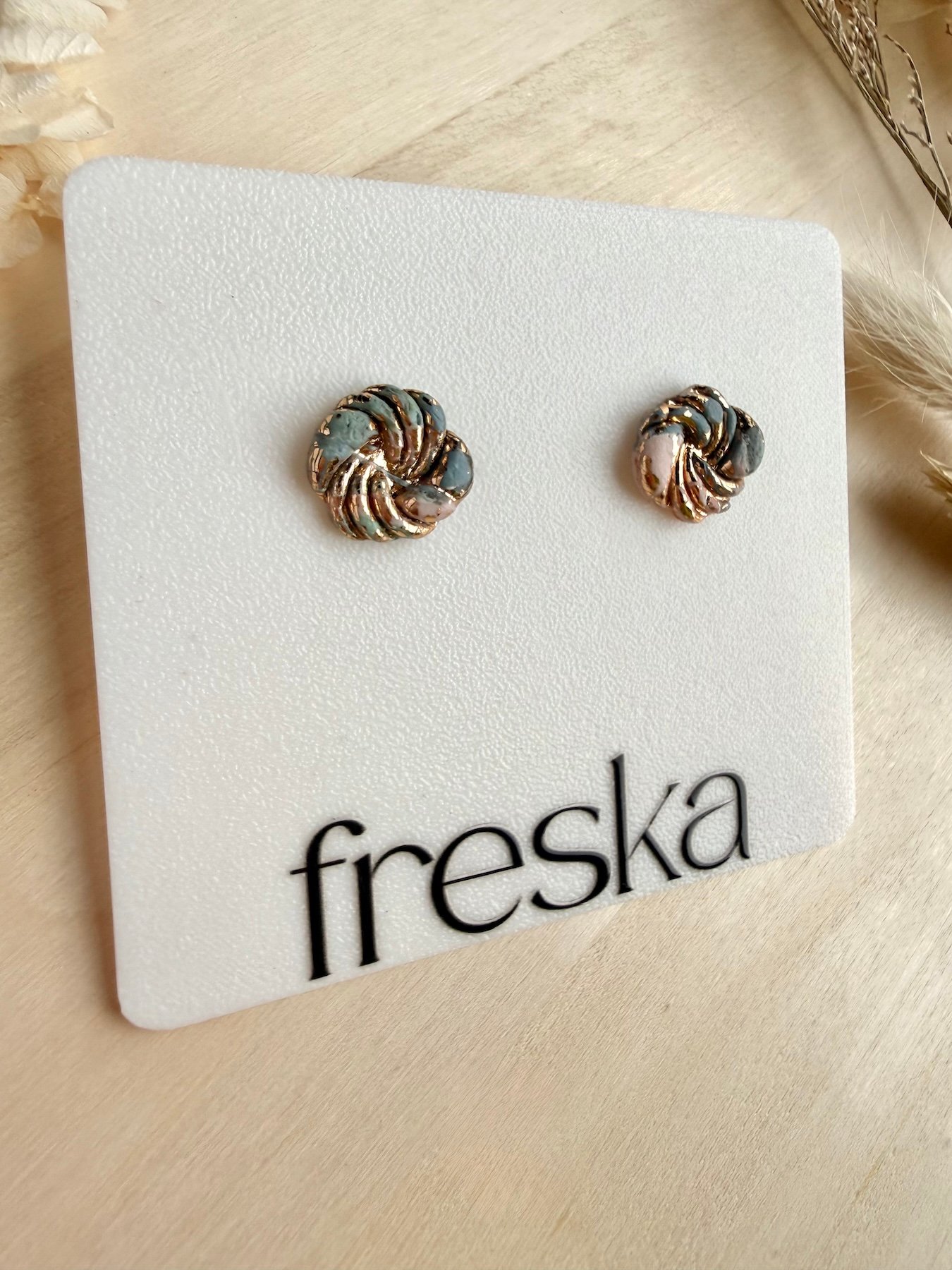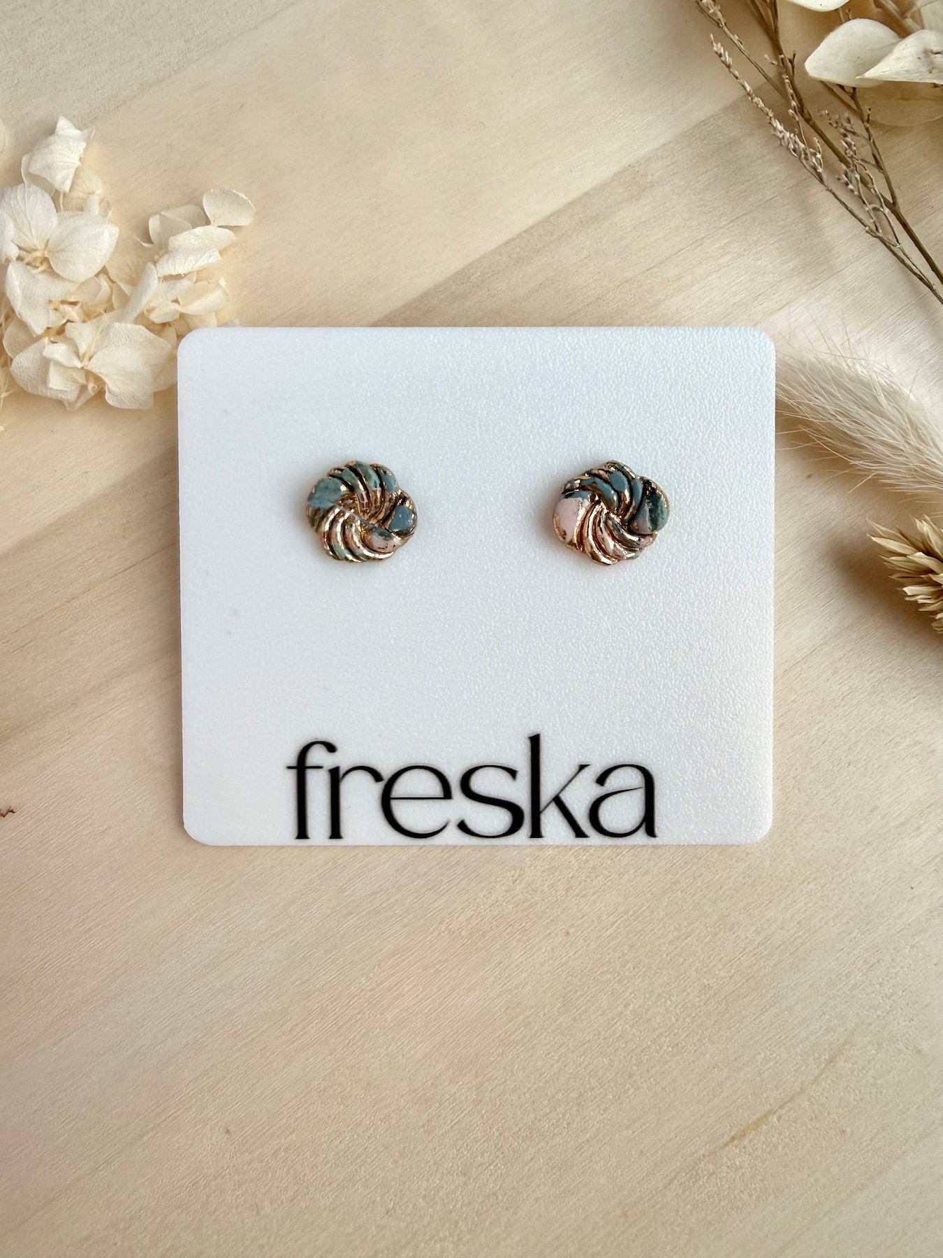 Kolczyki powstają w krótkich, autorskich seriach, dlatego rozmieszczenie kolorów i złotych detali może minimalnie różnić się między parami, co podkreśla ich unikatowy charakter. Sztyfty ze stali chirurgicznej są hipoalergiczne i odporne na codzienne użytkowanie, dzięki czemu kolczyki świetnie sprawdzą się także u osób z wrażliwą skórą.