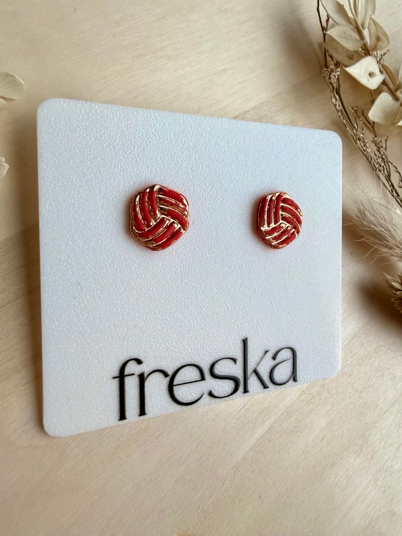 Dodaj energiczny, nieco retro akcent do swoich stylizacji z ręcznie wykonanymi kolczykami w odcieniu głębokiej czerwieni! Geometryczny kształt z przeplatanym wzorem i złotymi liniami pięknie odbija światło i świetnie uzupełni zarówno codzienne, jak i wieczorowe zestawy.