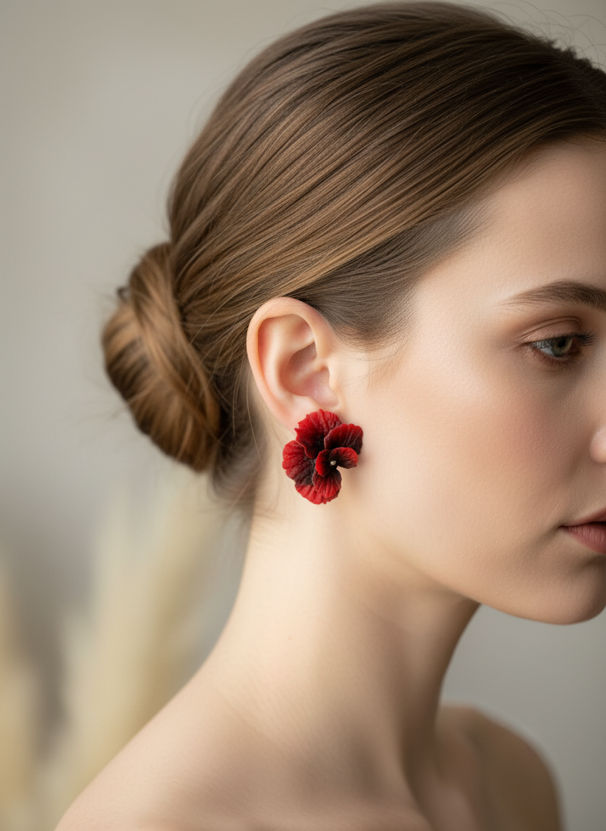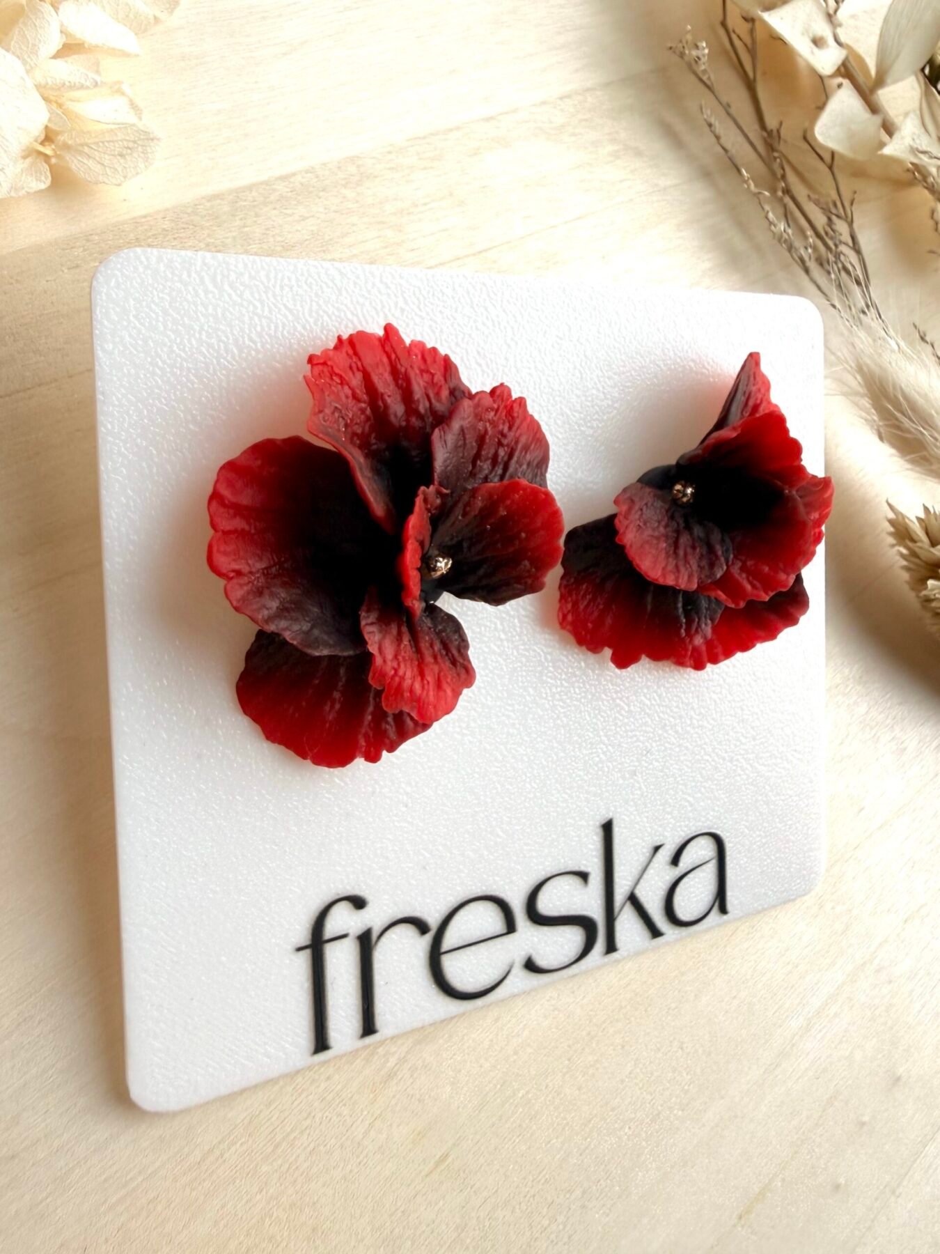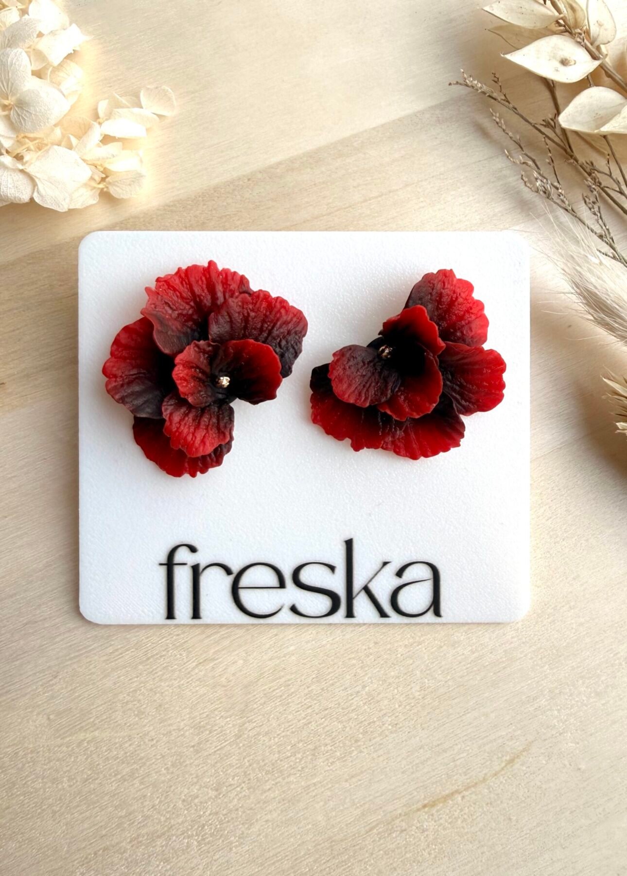 Wprowadź się w ognisty klimat flamenco z asymetrycznymi kolczykami, które otulają płatek ucha niczym płynący płatek kwiatu! Ręcznie modelowane warstwy czerwonych płatków z przyciemnionymi końcówkami oraz złotą kropką w centrum dodają biżuterii trójwymiarowości i sprawiają, że każdy egzemplarz jest niepowtarzalny. Kolczyki zostały wykonane z wysokiej jakości gliny polimerowej, a ich metalowe elementy to stal chirurgiczna, dzięki czemu są lekkie, trwałe i komfortowe w noszeniu.