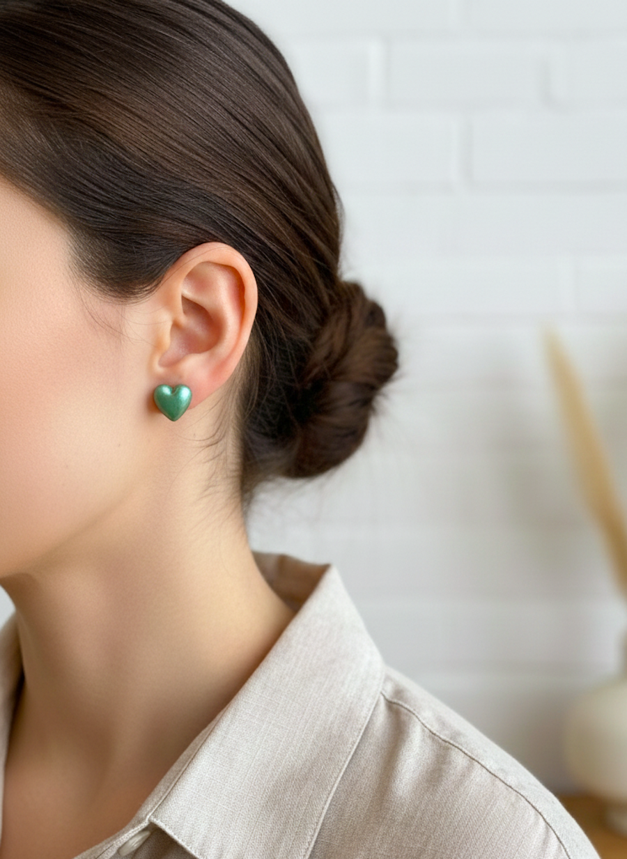 Postaw na wyjątkowy, „syreni” blask z trójwymiarowymi kolczykami–serduszkami w opalizującej zieleni! Wypukłe serca z gliny polimerowej połyskują różowo–turkusową poświatą niczym łuski syrenki, a całość osadzona jest na bazie ze stali chirurgicznej, odpowiedniej także dla wrażliwych uszu.