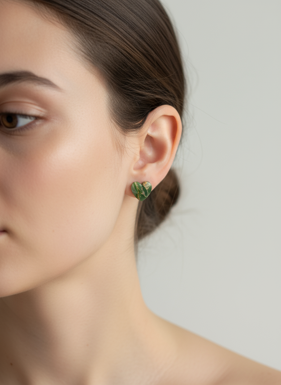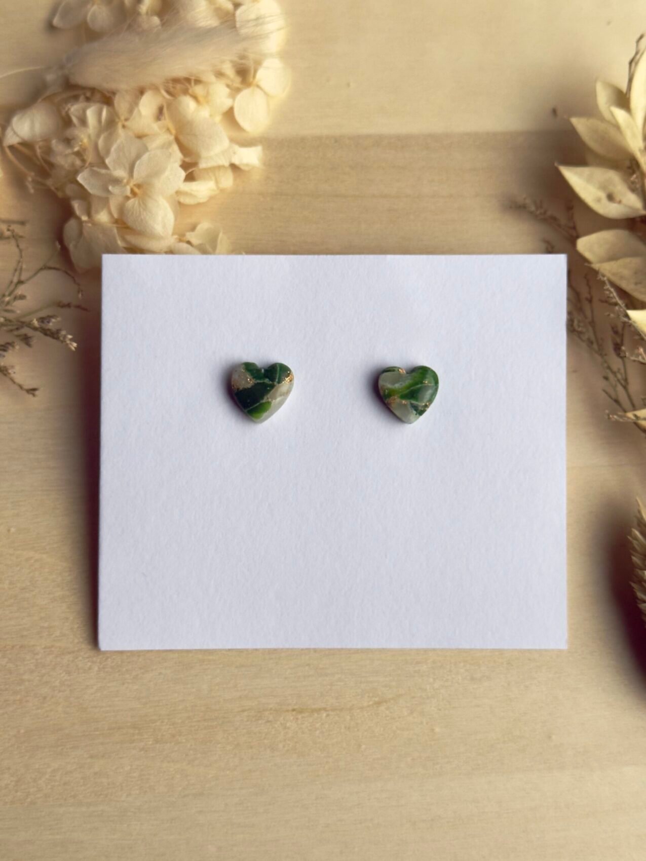Urocze, drobne kolczyki w kształcie serduszek wykonane z ręcznie mieszanej gliny polimerowej. Połączenie głębokiej zieleni, jasnych akcentów i delikatnych, złotych drobinek tworzy efekt małych, świątecznych kamieni, które pięknie rozświetlają okolice twarzy.